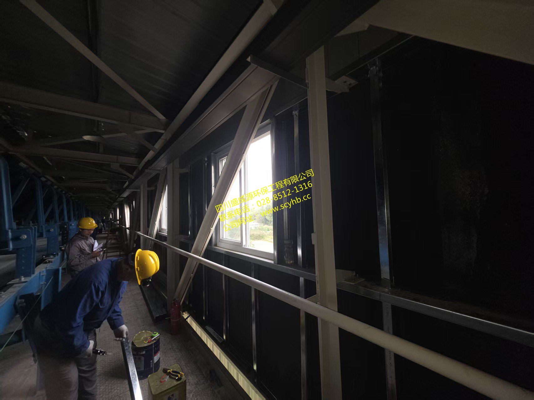 四川盛成源环保工程有限公司实地勘测现场噪声数据及廊道结构工况,结合国家工业厂界噪声环保排放标准,为中国电建蕲春公司量身定制专属廊道降噪综合治理方案。施工采用廊道整体全封闭隔声围护结构,高标准铺设阻尼复合隔声板,配套加装专业通风消声系统,对电机、减速机等核心设备加装弹簧减振降噪底座,从声源减振、传播隔声、通风消声全方位管控,杜绝噪声外泄及结构振动传声问题。施工全程严格遵循环保施工及工业安全施工规范,精细化做好所有板材接缝、墙体孔洞密封封堵及钢结构防腐防锈加固处理,严控施工细节,杜绝漏声隐患,保障整体降噪施工质量。